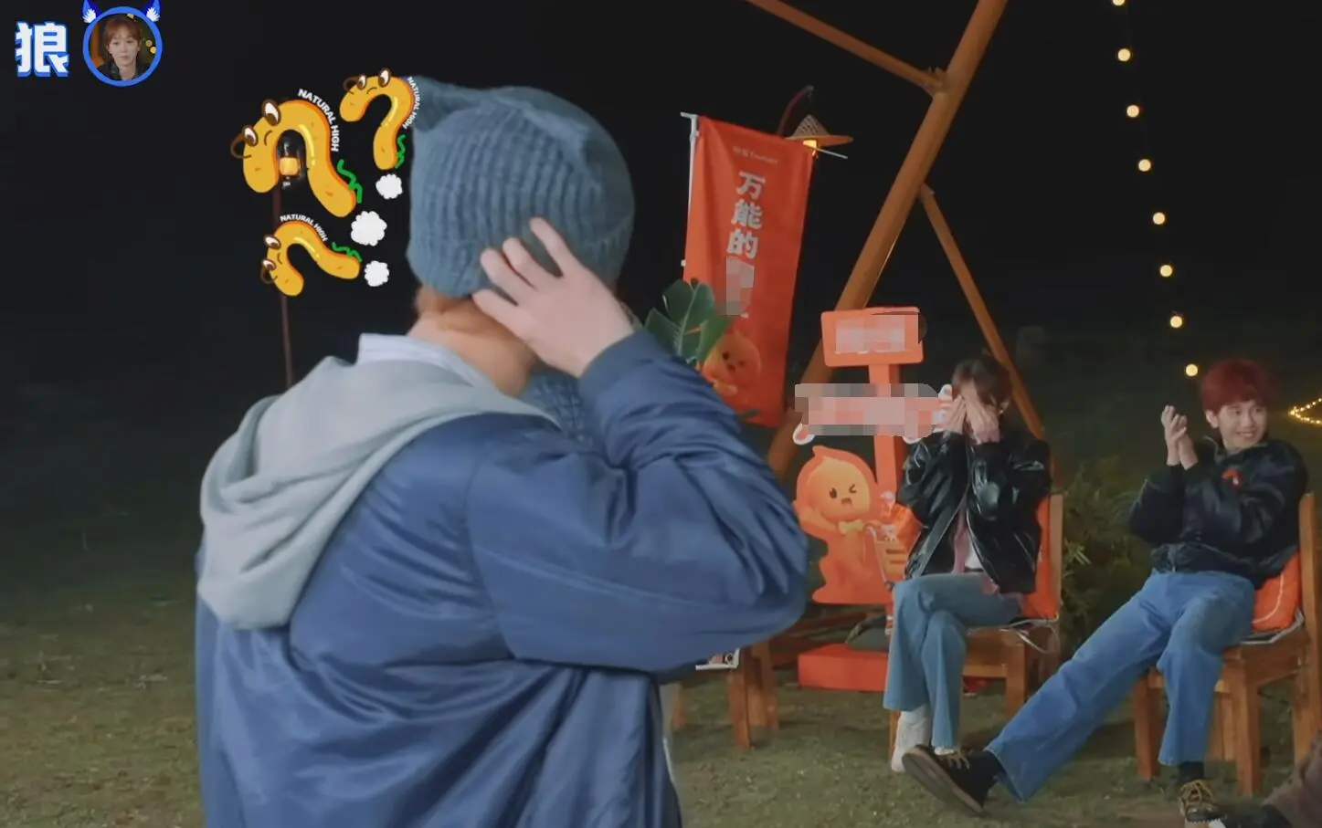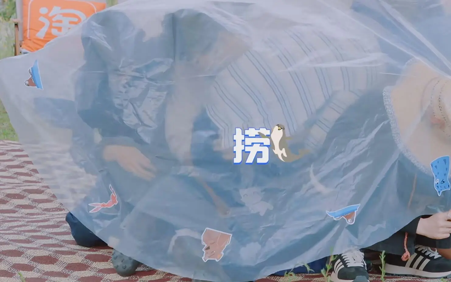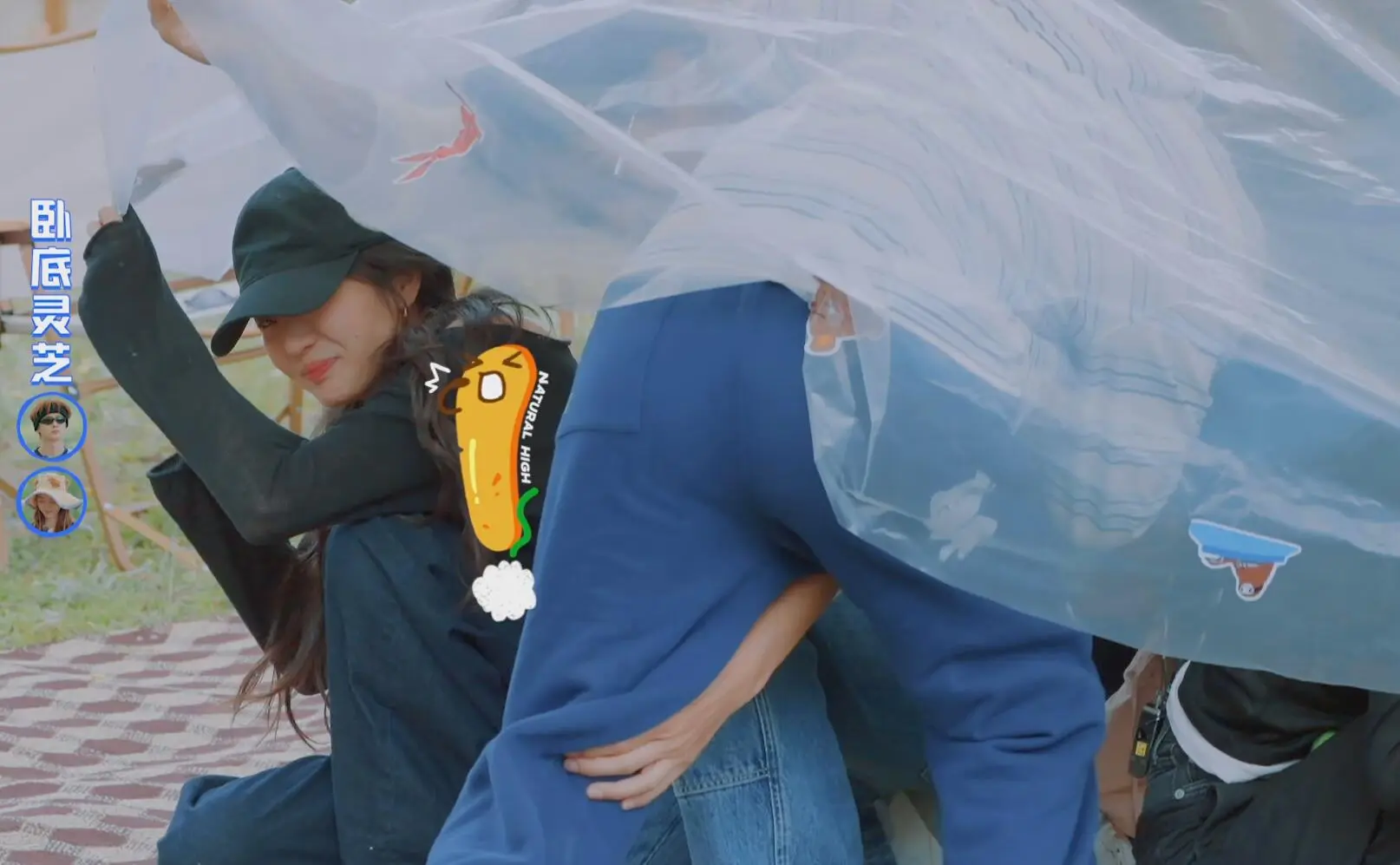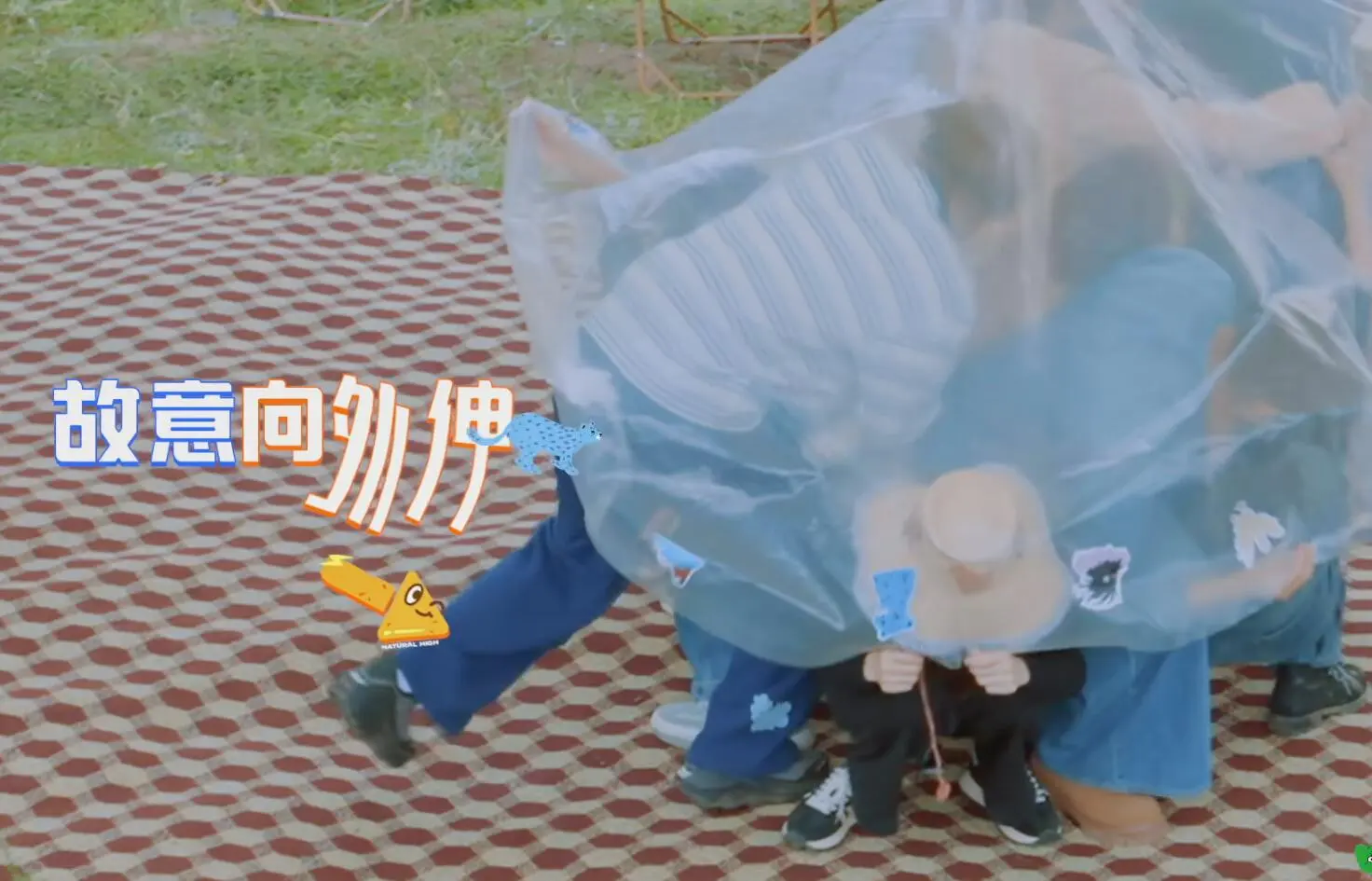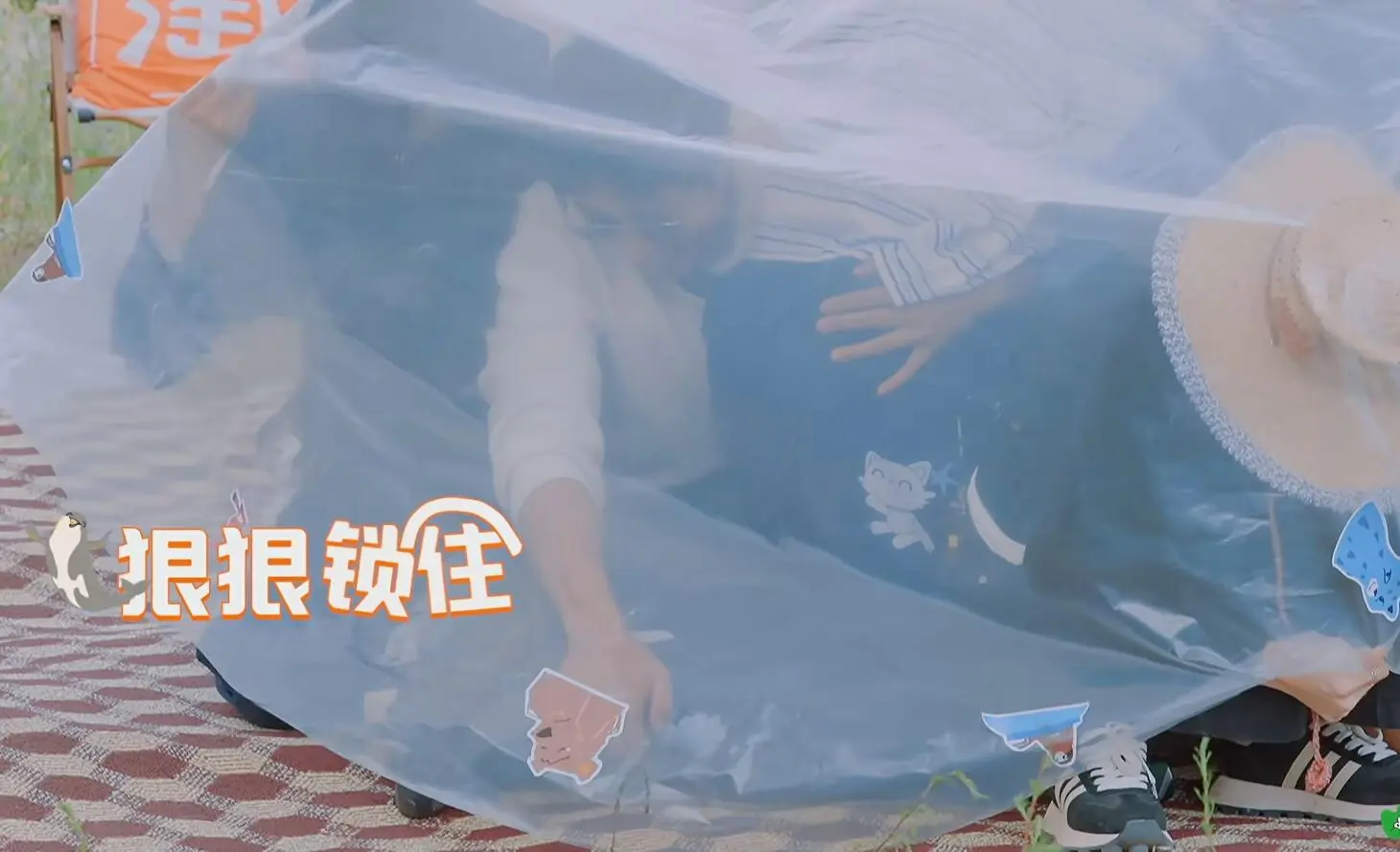 黄景瑜钻进塑料布之后,看到旁边的白敬亭腿在外面,二话不说就用武力值把白敬亭的腿掰到了塑料布里面。