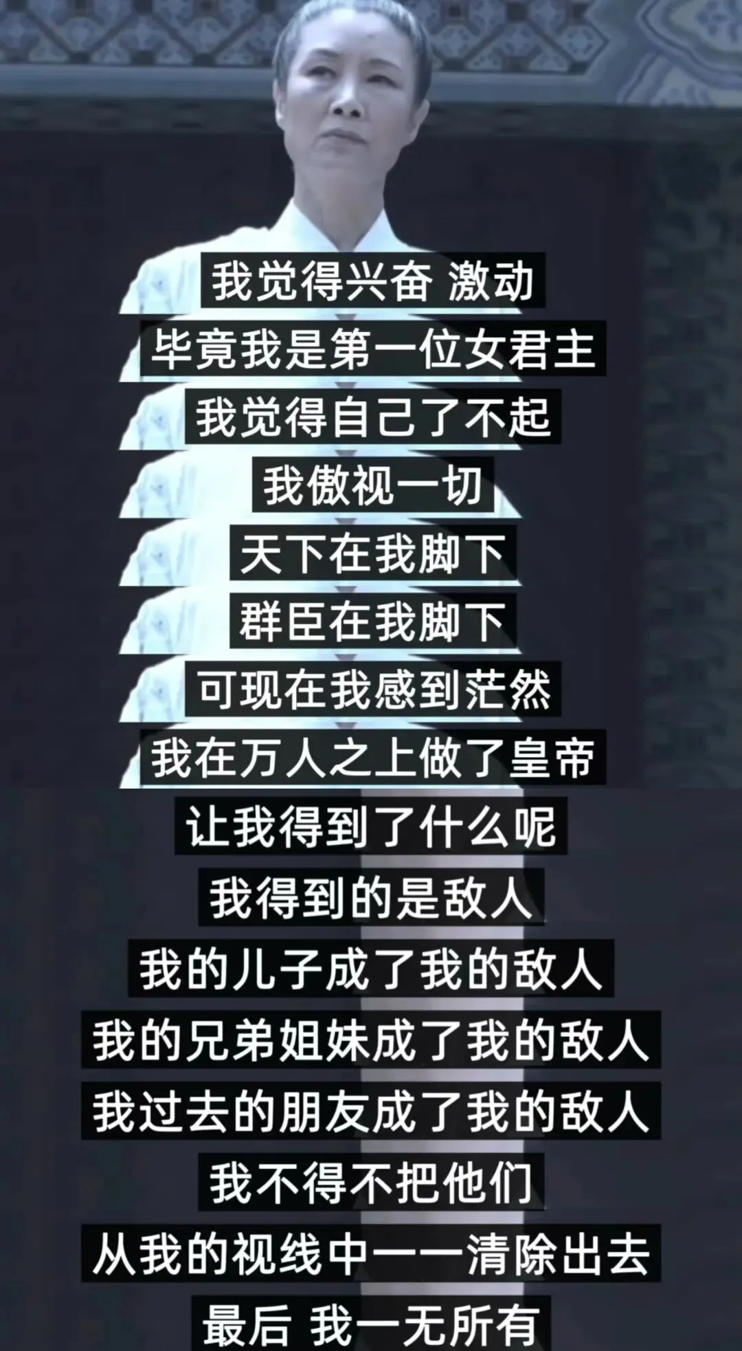 “我是第一位女君主,我觉得自己了不起,可现在我感到茫然,我在万人之上做了皇帝,我得到的是……敌人。”